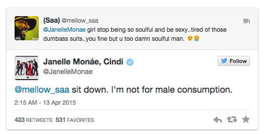 After an outlandish (but later apologetic) fan sent Janelle Monáe criticised the "Electric Lady" for her choice of clothing, she elegantly put him in his place. It's safe to say Janelle and many other women choose to dress for themselves, rather than the attention or approval of others, be it male or female.